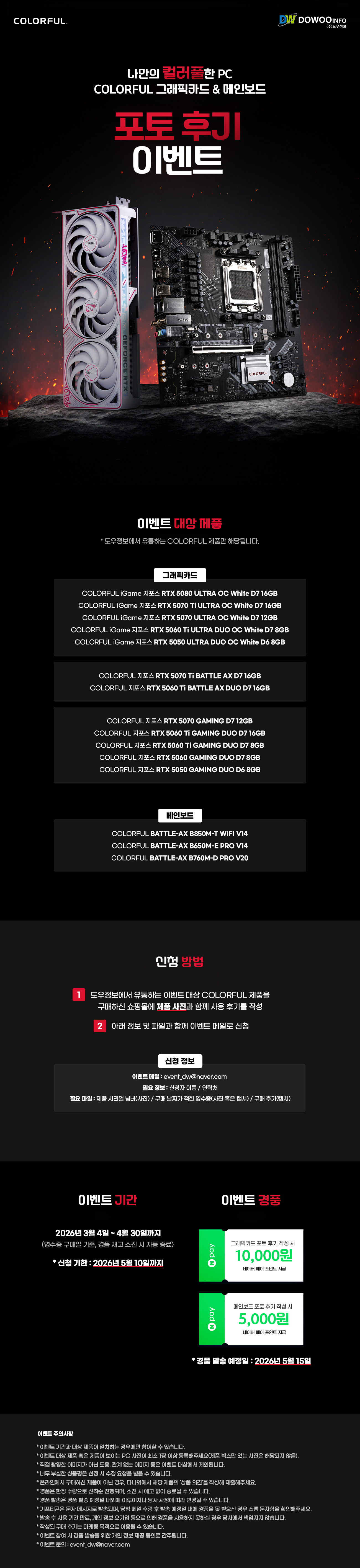 이번 이벤트는 컬러풀의 화이트 감성 Ultra 시리즈, 가성비 끝판왕 Battle-AX 시리즈 등 폭넓게 진행됩니다.